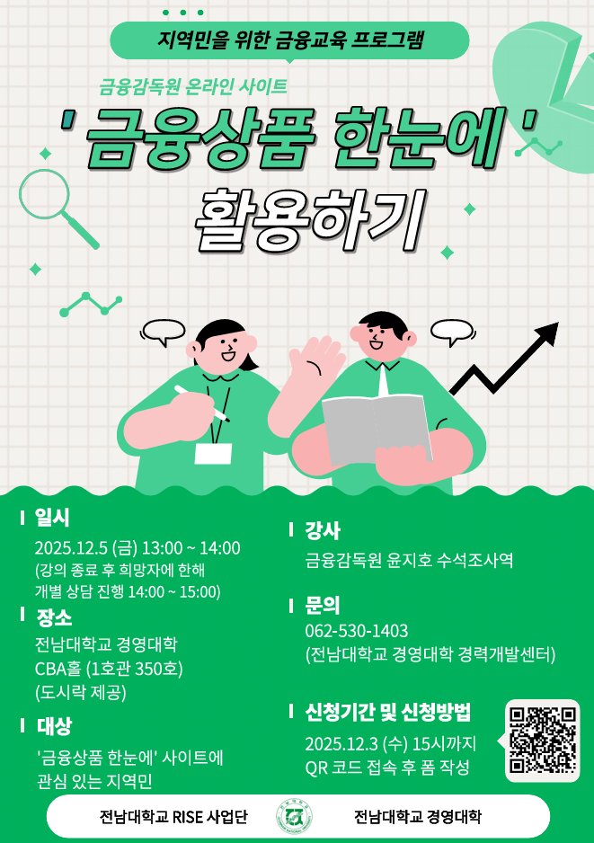 fnctId=bbs,fnctNo=1615 글번호 941145 [전남대학교 RISE 사업] 지역민을 위한 금융교육 프로그램 - 금융상품 한눈에 활용하기 작성일 2025.11.26 수정일 2025.12.01 작성자 관리자 조회수 646 첨부파일 첨부파일이(가) 없습니다.